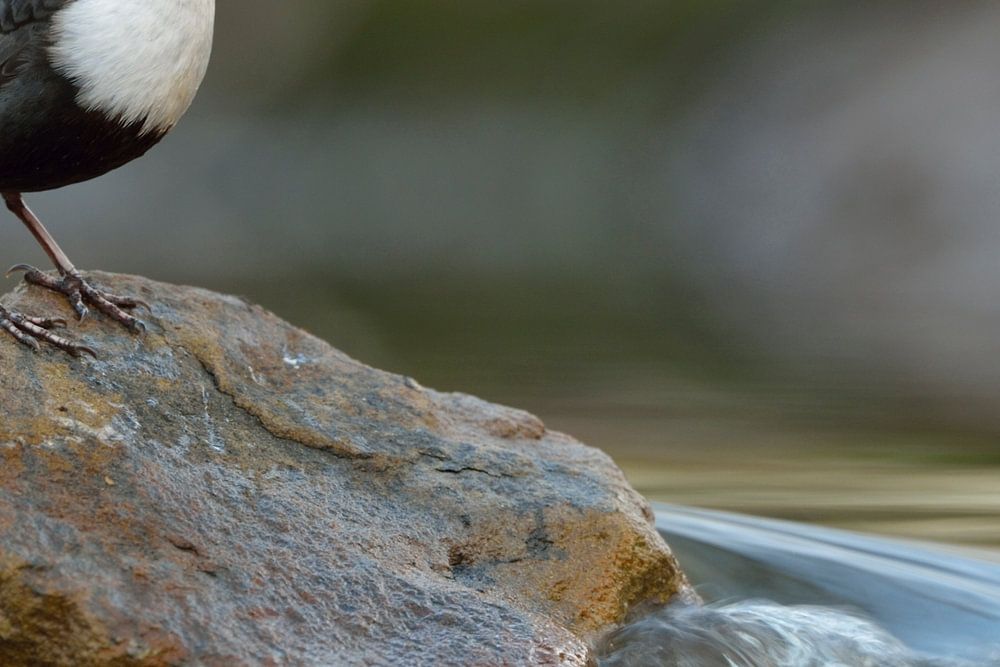 Waterspreeuw ( Cinclus cinclus) in zijn typische habitat, hoog op een steen staand , omgeven door de sterke stroming van een snelstromende beek, kleinere rivier, wilde dieren, Europa.