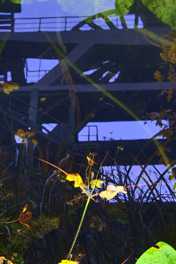 De kronkelende toren van de mijn Ewald in Herten wordt weerspiegeld in een beekje