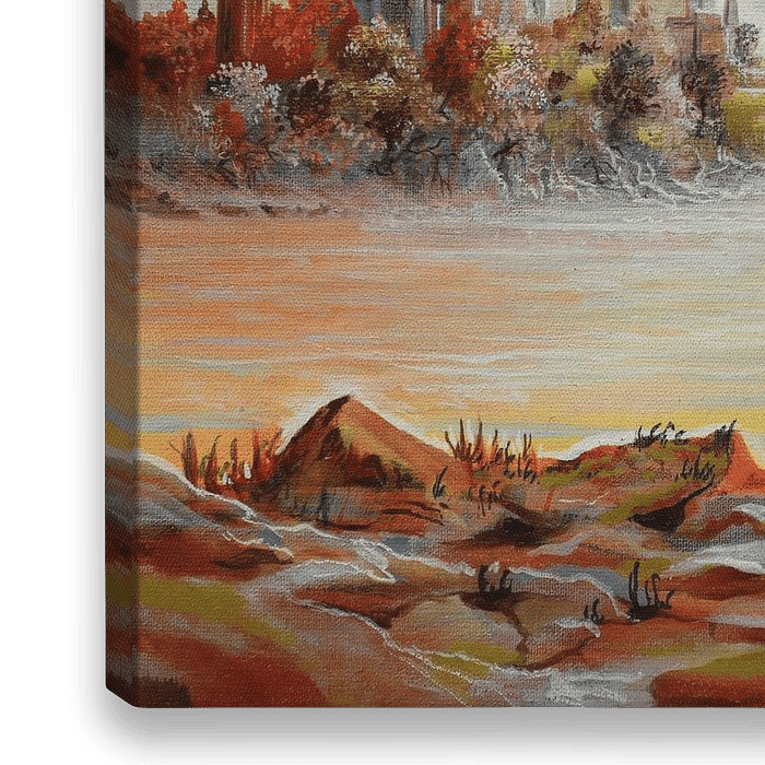 Dit schilderij toont een fascinerend tafereel van 2 kleine eilanden waar een stad over uitkijkt. De steden op de eilanden doen denken aan middeleeuwse architectuur, met hoge en surrealistische torens die tot in de hemel reiken. Deze voorstelling creëert een tijdloze sfeer en geeft de indruk dat deze steden in een ander tijdperk…