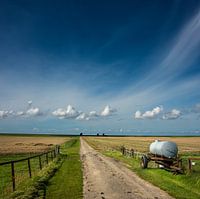Een watertank staat naast een eenzame polderweg in Noord-Groningen. Aan de horizon mooie stapelwolken boven de Waddendijk.