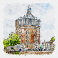 Digitaal aquarel van de prachtige watertoren De Esch in Rotterdam (in de wijk Kralingen). Deze watertoren is gebouwd tussen 1871 - 1873 en is daarmee de oudste, nog bestaande, watertoren van Nederland. Met een tankinhoud van 1 miljoen liter water was dit ook de grootste watertoren van Nederland, maar inmiddels is de watertank verwijderd en zit hier nu o.a. een restaurant in gevestigd.