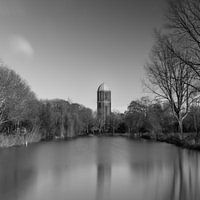 Mooie karakteristieke watertoren in het park in de Utrechtse wijk Overvecht is een mooie bakstenen toren met mooie reflectie in het water.