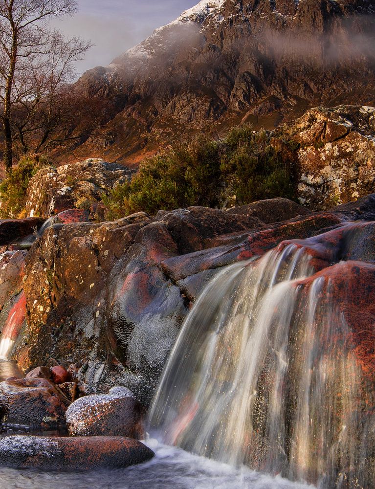 Een prachtige waterval onderaan de Buachaille etive mòr in Glencoe, tijdens een koude november ochtend. Het was wachten totdat de mist uiteindelijk verdween en de prachtige berg tevoorschijn kwam! Een van mijn favoriete foto's van deze trip naar Schotland.