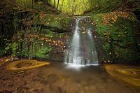 Waterval Butzerbachtal tijdens de herfst in de Eifel, Duitsland. Foto gemaakt met een lange sluitertijd voor een mooi effect, melkachtig water.