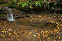 Waterval Butzerbachtal tijdens de herfst in de Eifel, Duitsland. Foto gemaakt met een lange sluitertijd voor een mooi effect, melkachtig water.