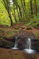 Waterval Butzerbachtal tijdens de herfst in de Eifel, Duitsland. Foto gemaakt met een lange sluitertijd voor een mooi effect, melkachtig water.