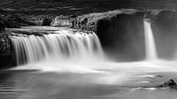 Een 16:9 foto in Zwart-Wit van de Godafoss, een van de grotere watervallen van IJsland. Hij is gesitueerd in het district Mývatn in Noord-IJsland aan het begin van de Sprengisandur-route, die dwars door het binnenland voert.