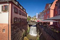 In het centrum van Saarburg is een waterval met verschillende waterraderen (Rijnland-Palts, Duitsland).