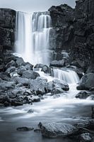 Een verticale foto in Zwart-Wit met een lange belichting van de Oxararfoss, een 20 meter hoge waterval in IJsland in het Nationale park Thingvellir.