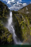 Waterval en regenboog Nieuw Zeealand. Milford Sound. Jungle.