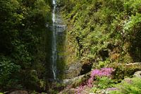 Waterval en roze geraniums in laurisilva van Madeira, Portugal. Foto is gemaakt bij de levada in Folhadal.