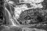 Tufsteenwaterval bij Baume-les-Messieurs in het Juragebergte in de regio Bourgogne Franche Comté in Frankrijk zwart-wit.