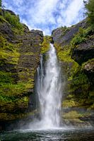 Een van de ontelbare watervallen in IJsland. Het vallende water heeft een diepe spleet in de rots uitegesleten.