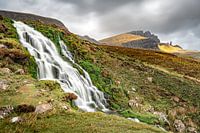 Waterval in de bergen op het Schotse eiland Skye. Op de achtergrond de piek van Old Man of Storr. Ruig landschap in ruig weer.