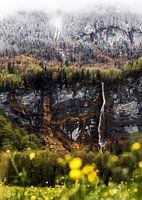 Ik maakte deze foto in Zwitserland. In de ochtend werden we wakker en had het bovenin de bergen onverwacht gesneeuwd. Later op de dag reden we met de auto door de prachtige landschappen en ineens zag ik deze waterval. Ik moest er een foto van maken! Als voorgrond heb ik een bloemenveld gebruikt. Ik vind de combinatie bovenin besneeuwde dennenbomen en onderin bloemen erg tof.