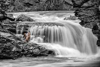 Waterstroom in zwartwit gemaakt in Canada bij de Johnstone Canyon., stukje drijfhout heeft nog wel kleur.
