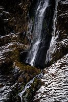 Deze dynamische opname toont een waterval die zich een weg baant langs een met sneeuw bedekte rotswand, waar mos en ijs in een harmonieus spel van kleuren en texturen samenkomen. Het vallende water contrasteert met de ruige, met sneeuw bedekte heuvels, wat een gevoel van beweging en frisheid in een stille, koude omgeving creëert. Een prachtig kunstwerk voor liefhebbers van de rauwe schoonheid van de natuur.