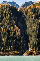 Waterval in de herfst. Deze foto laat de prachtige herfstkleuren zien in de Oostenrijkse alpen. Deze foto werd genomen in de buurt van de Kaunertaller gletsjer in tirol. De kleuren van het lichtblauwe meer zijn goed te zien.