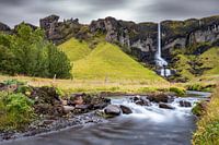 Opname met lange belichting van vloeiend stromend water in een beek met een waterval op de achtergrond in IJsland. Er zijn donkere stormwolken boven de bergrug op de achtergrond tijdens deze stormachtige zomerdag in Zuid-IJsland.