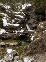 Ingebed in rots en steen ligt midden in het bos de Kuhfluch waterval in Farchant. Vers helder bergwater, je voelt de kou, de sneeuw ligt nog op de rotsen. Een kleine idylle om opgelucht adem te halen.