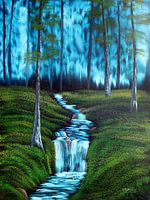 Bosgezicht met stromende beek en waterval. Originele werk is gemaakt in olieverf
