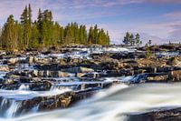 Er zijn veel prachtige watervallen in Zweden. Een ervan valt als een trapje naar beneden. De zon is net op en het eerste licht van de dag valt op het prachtige landschap.