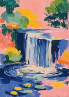 Dit schilderij toont een waterval in een park, gerealiseerd in gouache en olieverf. De minimalistische compositie maakt gebruik van een sterk, pastelkleurig palet van roze, blauw, groen en geel. Heldere vormen, vlakke kleuren en expressieve penseelstreken in de stijl van Henri Matisse geven het tafereel diepte en levendigheid. De naïeve, vlakke stijl benadrukt de eenvoud en harmonie van het landschap, terwijl tropische planten en waterbeweging het motief verlevendigen. De gereduceerde, kleurrijke voorstelling straalt rust, vreugde en een charmante, artistieke interpretatie van een stedelijke natuurervaring uit in een kleurrijke, pastel-harmonieuze sfeer.
