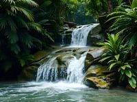 De foto toont een schilderachtige waterval in een tropisch regenwoud. Het water stroomt over verschillende rotstrappen en vormt kleine cascades die uitmonden in een kalme poel. De waterval is omgeven door weelderige, groene vegetatie, waaronder grote palmbladeren en andere tropische planten. Het landschap ziet er vredig en ongerept uit…