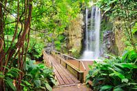 Prachtige opname van een groene jungle-achtige omgeving met een waterval en een brug