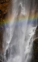 Deze foto toont een waterval in de Oostenrijkse Alpen met een regenboog.