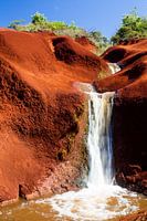 Een waterval snijdt door rode rotsen in Waimea Canyon, Kauai, Hawaii, USA.