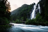 Een waterval in de Dolomieten bij zonsondergang.