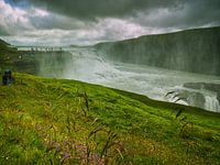 De Gullfoss waterval in IJsland, onderdeel van de gouden cirkel; Gulfoss, Geysir en Thingvellir. Doordat we heel vroeg bij deze waterval waren was het gelukkig nog niet zo druk. De lucht richting het binnenland was erg dreigend, en de zon scheen in onze rug waardoor de wolken mooi belicht werden.