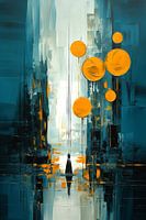 Ondersteboven lijkt het als een stil wateroppervlak dat de bovenste wereld reflecteert. Op de bovenste helft sieren donkergele en oranje cirkels de lucht als zacht gloeiende planeten, gehuld in een rustige dans.