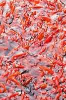 Hoge hoek close-up van een watervijver met ontelbare kleine rode visjes aan het oppervlak