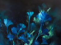 Een donkere onderwater wereld met geschilderde blauwe bloemen. De kleuren vloeien over in het water op dit digitale schilderij.