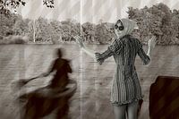 Collage en fotobewerking van een landschap, vrouw en stof met lijnen in zwartwit en sepia.