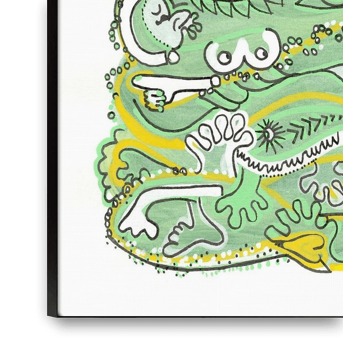 Dit levendige kunstwerk in tinten groen, wit, geel en zwart symboliseert onze gedeelde menselijke ervaring. Net zoals deze kleuren harmonieus maar toch duidelijk samensmelten, zoeken ook wij als individu naar genegenheid, erkenning, medeleven en een veilige omgeving om te floreren.