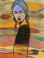 Een abstract portret van een vrouw, in de achtergrond goudkleurige golven vermengd met diverse warme tinten.