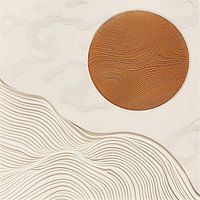 Modern abstracte driedimensionele afbeelding van de zon boven golven in de zee. Organische ronde vormen in wit, beige en bruin. Mooie natuurlijke tinten. Een indrukwekkend schouwspel van diverse materialen en vormen. Passend bij verschillende trends, zoals modern abstract, modern, zomer, zee, strand, naturel, Japandi. Artist: Bianca ter Riet