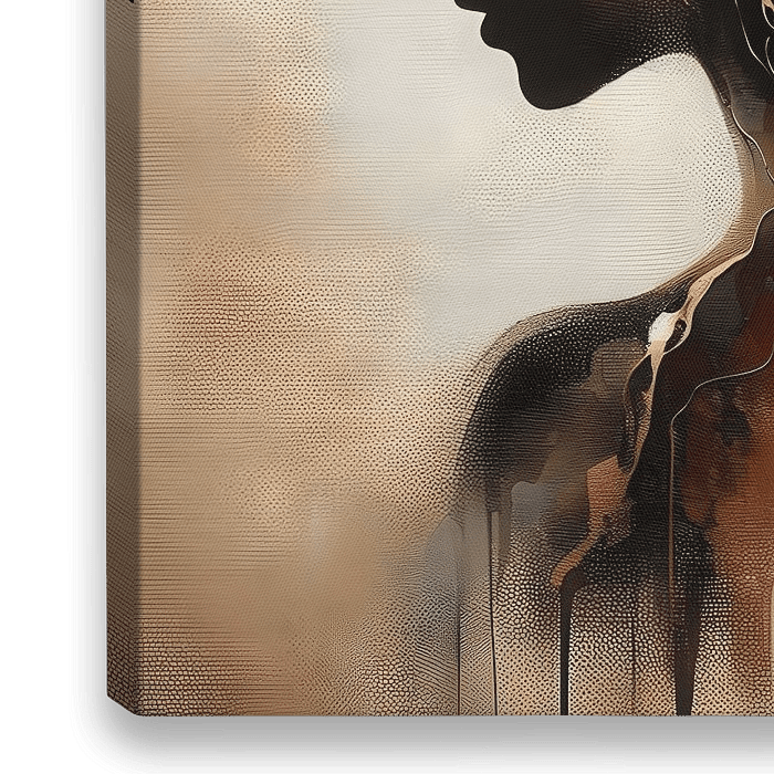 Laat u meevoeren door de mystiek en elegantie van dit abstracte olieverfwerk, waarin een vrouwelijk silhouet met golvend haar is weergegeven in warme bruin-, beige- en goudtinten. De vloeiende lijnen van haar figuur en golvende lokken versmelten subtiel met de achtergrond, waarbij diepe bruintinten een uitnodigende warmte en diepte…