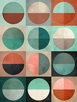 Een reeks cirkels waarin kleuren en segmenten elkaar afwisselen. Het strakke patroon en de textuur creëren een retro en speels geometrisch kunstwerk.