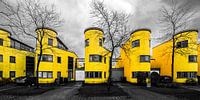 Huizen in de Regenboogbuurt van Almere. Foto bewerkt, zwart-wit en geel.