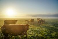 Koeien in de wei met kalfjes. In het voorjaar mag bij boer Salman en zijn zoon in Noordwijk de koeien met hun nieuwe kroost weer naar buiten. Prachtig om te zien hoe blij ze zijn en als je dan ook nog een mooie zonsopkomst hebt met nevel is het plaatje helemaal compleet.