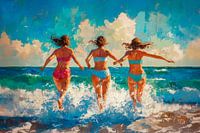 Een kunstwerk met drie vriendinnen die plezier hebben bij de zee. Het schilderij is in de stijl van het impressionisme met zichtbare penseelstreken en het gebruik van een paletmes. De scène toont een warme zomerdag met zonnestralen tussen de wolken door.