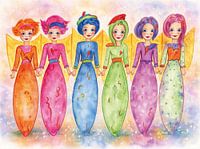 Op de foto staan zes stralende, engelachtige wezens naast elkaar en houden elkaars handen vast. Ze vormen een hechte, harmonieuze rij – bijna als een keten van licht en saamhorigheid. Elk figuur heeft: • een vriendelijk, kinderlijk open gezicht met rode wangen en een zachte glimlach • grote, stralende ogen die warmte en goedheid…