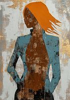 Weathered Beauty Silhouette - Dit vrouwen schilderij toont een gestileerde vrouwelijke figuur, zichtbaar vanaf de rug, met een levendig oranje haar en een jasje in afbladderend turquoise en roestbruin tegen een gouden en witte achtergrond die tekenen van verval vertoont.