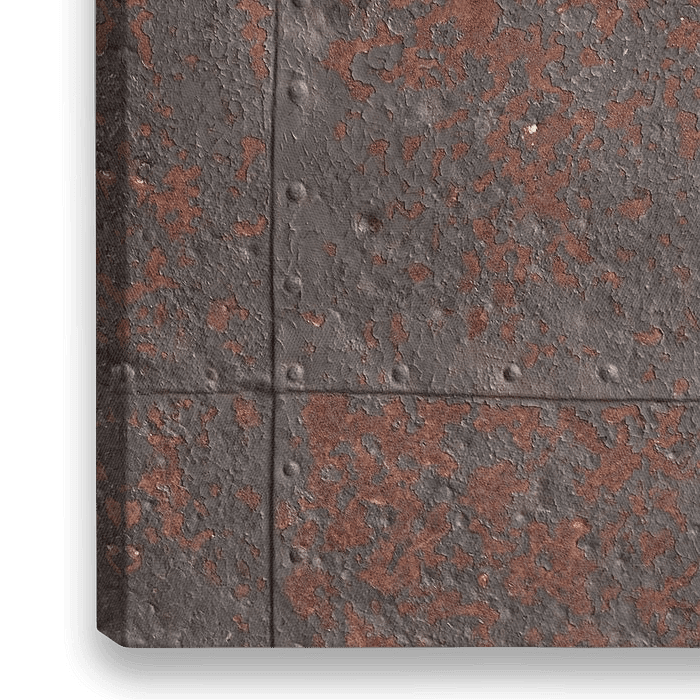 Een abstracte compositie van verweerd metaal waarin textuur en patina de hoofdrol spelen. De ingetogen kleuren en het industriële karakter geven dit werk een bijna schilderachtige uitstraling, ideaal voor een modern of industrieel interieur.