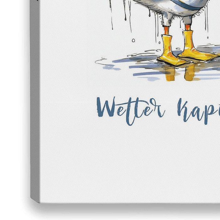 De illustratie toont een gestileerde zeemeeuw in een plas op een witte achtergrond. De zeemeeuw is levendig en gedetailleerd afgebeeld met een blauw-wit gestreept verenkleed, wat een frisse en maritieme uitstraling geeft. Onder haar ligt een plas waarin ze staat met felgele rubberlaarzen. De gele laarzen zijn zo groot dat ze bijna de…