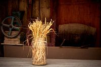 Een eenvoudige handvol verse tarwe in een glazen pot ligt op een tafel voor een paar rustieke boerderijartikelen.